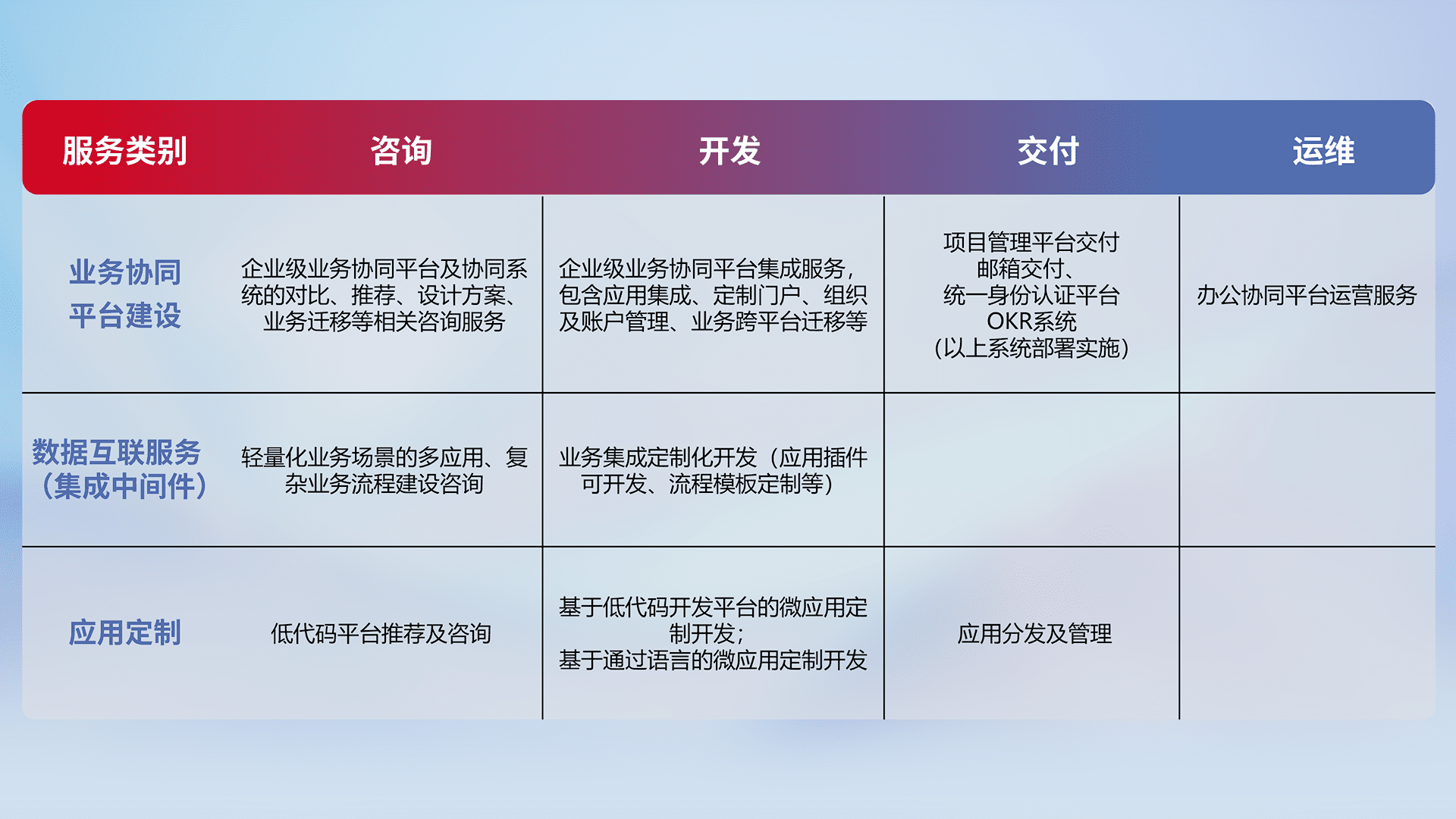 针对钉钉、、企微、、IDaas等平台级产品提供产品的规划、、、、方案、、、交付、、、、定制化开发等服务,,,,实现如统一协同办公、、、智能客户服务、、、、混合会议管理、、智能数据查询、、等业务场景,,,,实现数字化转型。。。
