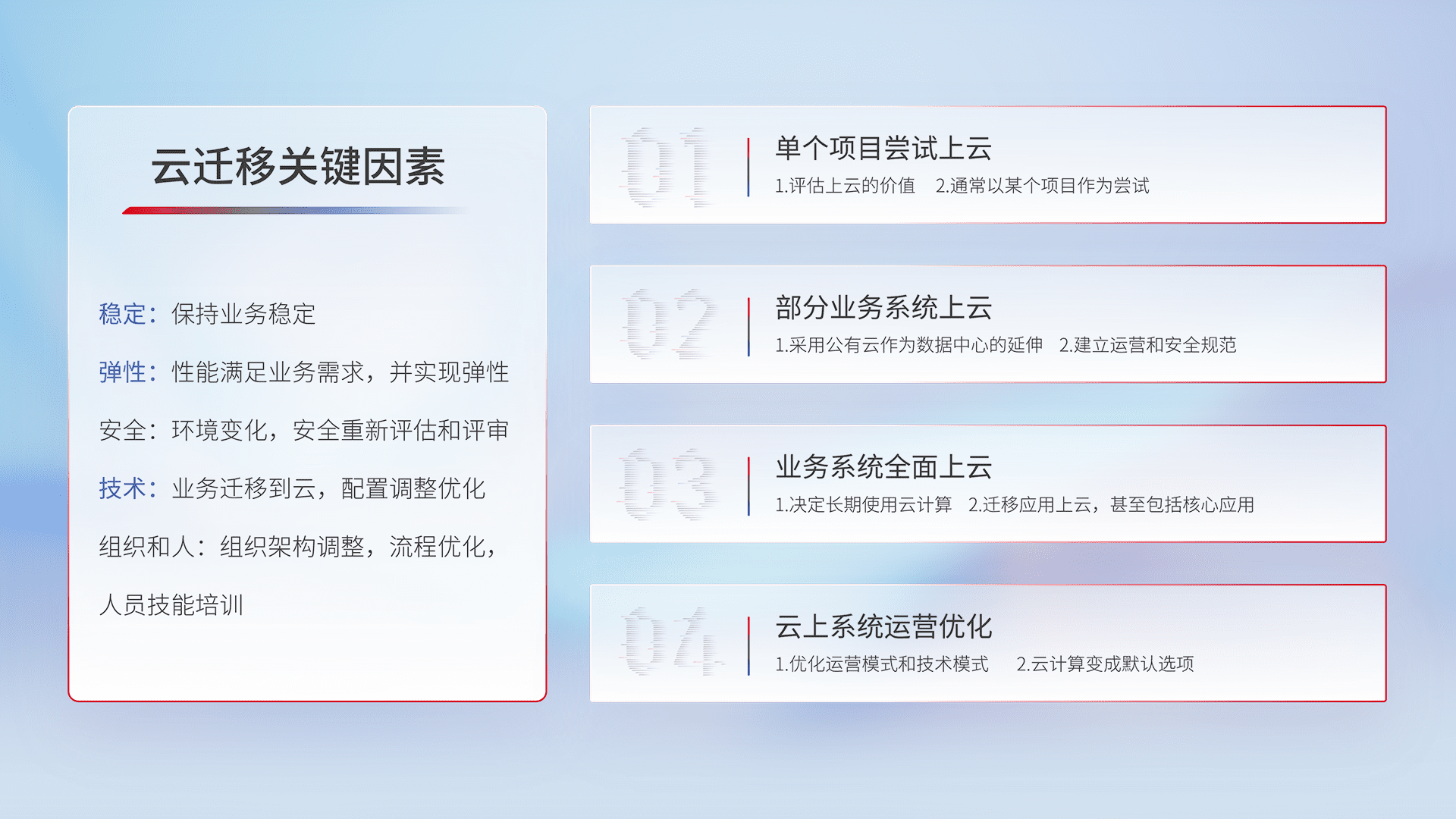 结合实际业务,,从规划设计、、云平台选型、、云原生改造、、、数据迁移、、、、集成交付,,,迁移全过程为客户识别最佳上云路径,,,做好风险识别管理,,设计网络架构、、身份权限、、、、安全审计合规、、、、操作审计、、、日志审计、、、监控告警策略、、多站点容灾设计等,,对云上基础设施进行整体规划,,,提升IT治理水平,,,,以满足弹性、、、、高可用、、、高性能的需求。。。