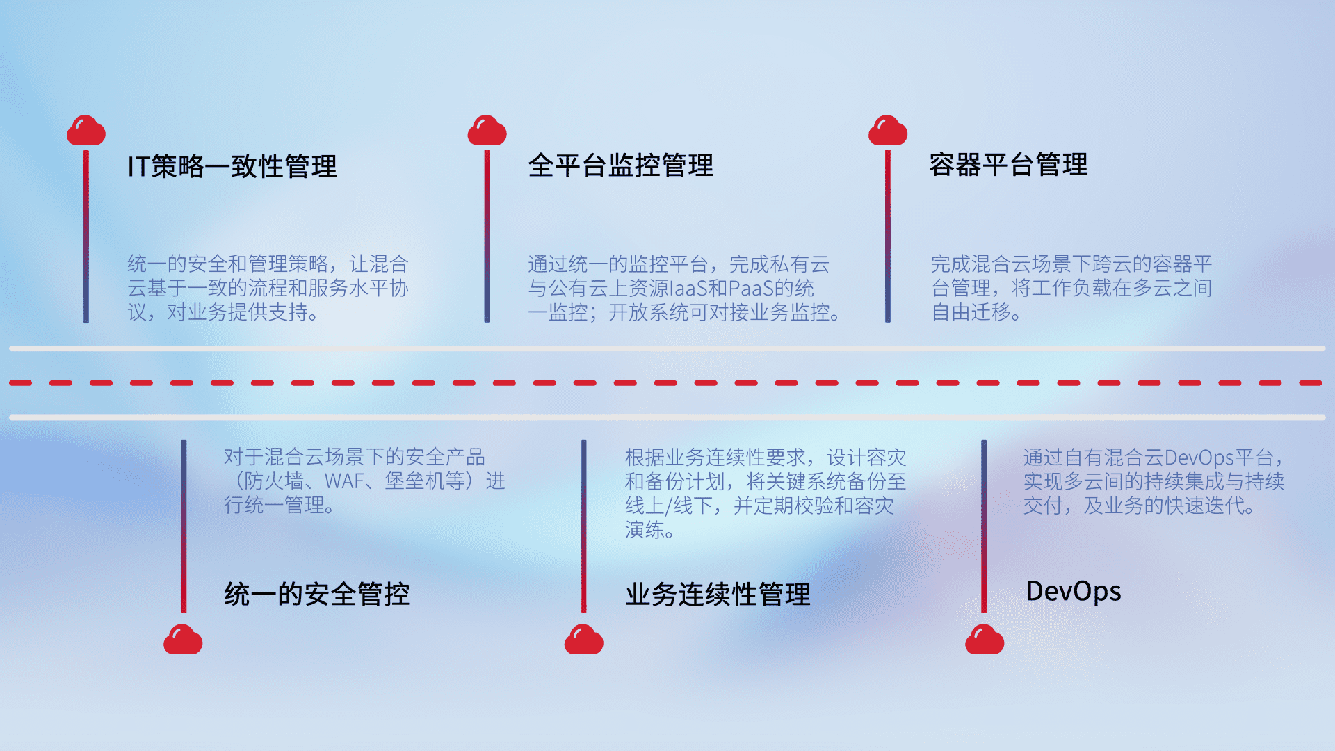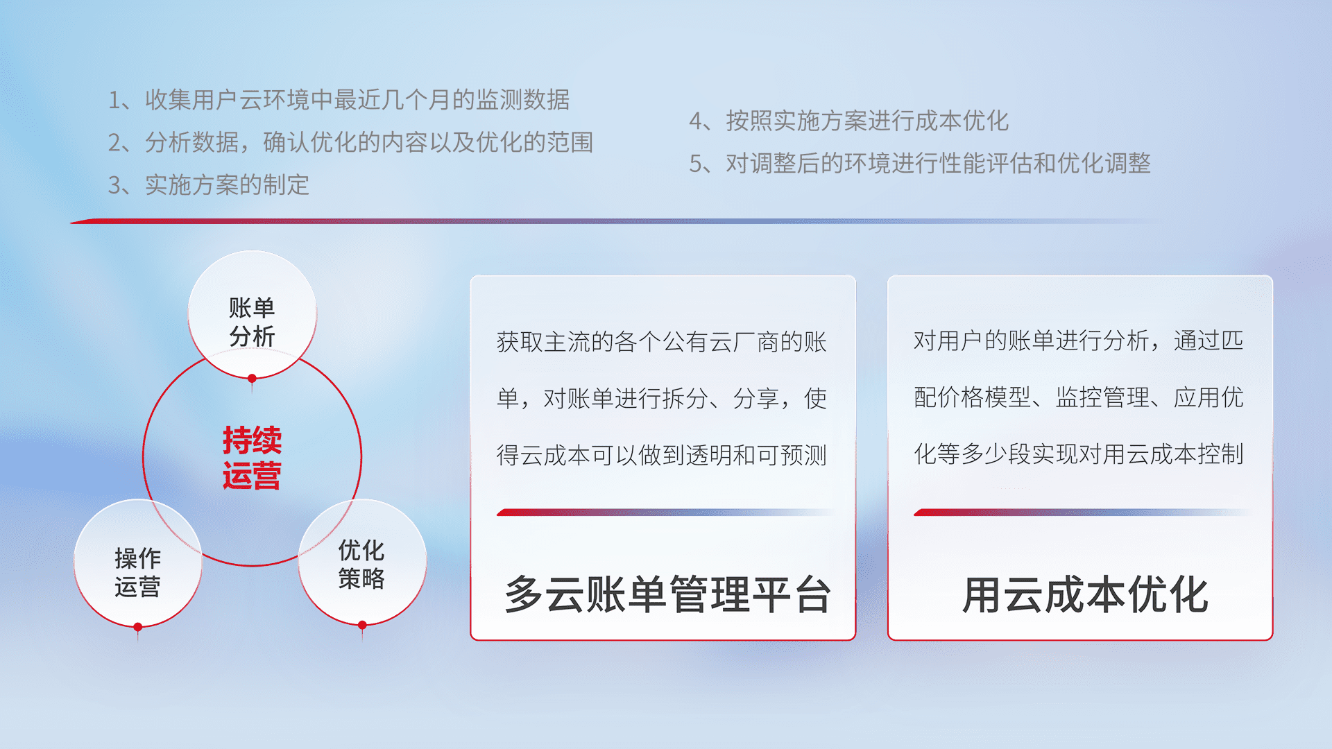 通过多云纳管,,,以统一的资源数据模型把客户的云资源进行抽象和封装,,进而实现对多云资源的统一操作,,保障云资源管理的可靠性、、、稳定性与可用性。。量身定制化运维内容,,,,配置、、开发运维、、补丁管理、、备份、、、监控、、、认证和访问管理、、审计和日常巡检等,,保障在用云过程中的可靠度,,,稳定度以及高可用率。。。。
