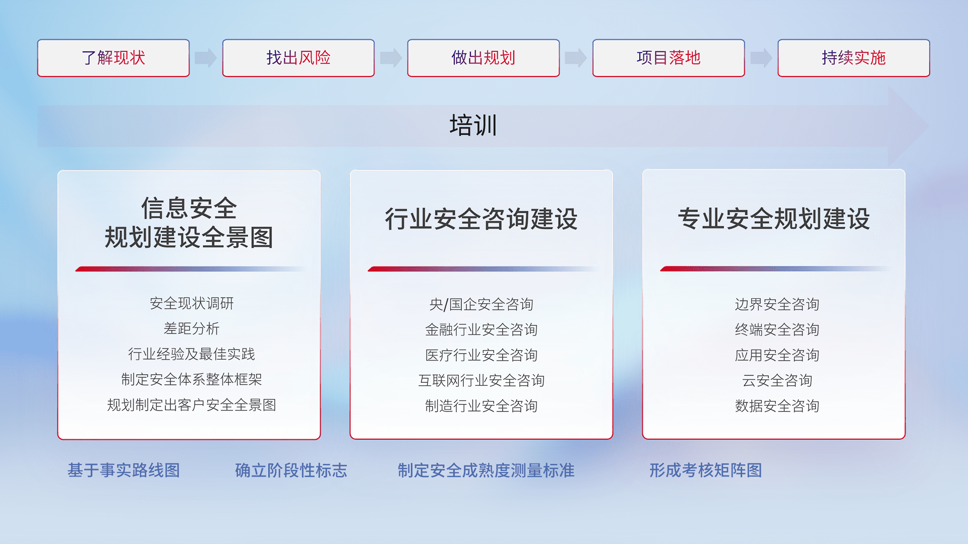 梳理客户信息安全现状调研、、差距分析结果,,,结合行业先进经验及最佳实践,,,,制订客户的信息安全管控体系总结架构,,,,最终形成一个完整的客户信息安全规划与建设的全景图。。