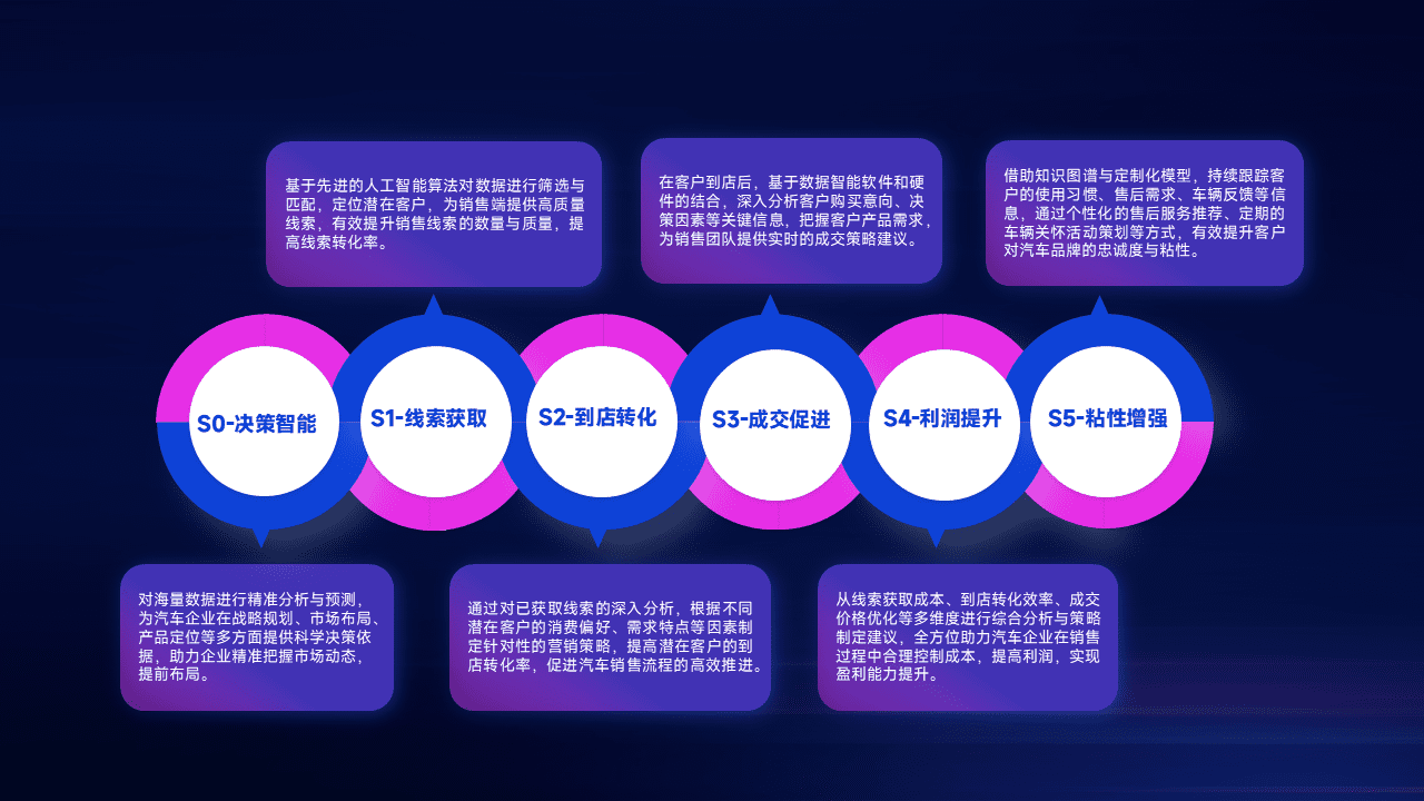 基于销售转化漏斗的薄弱环节,,,为客户提供数据+模型+运营的智能应用,,实现销售业绩的提升;推动线索管理全链路的精细化管理和运营。。。